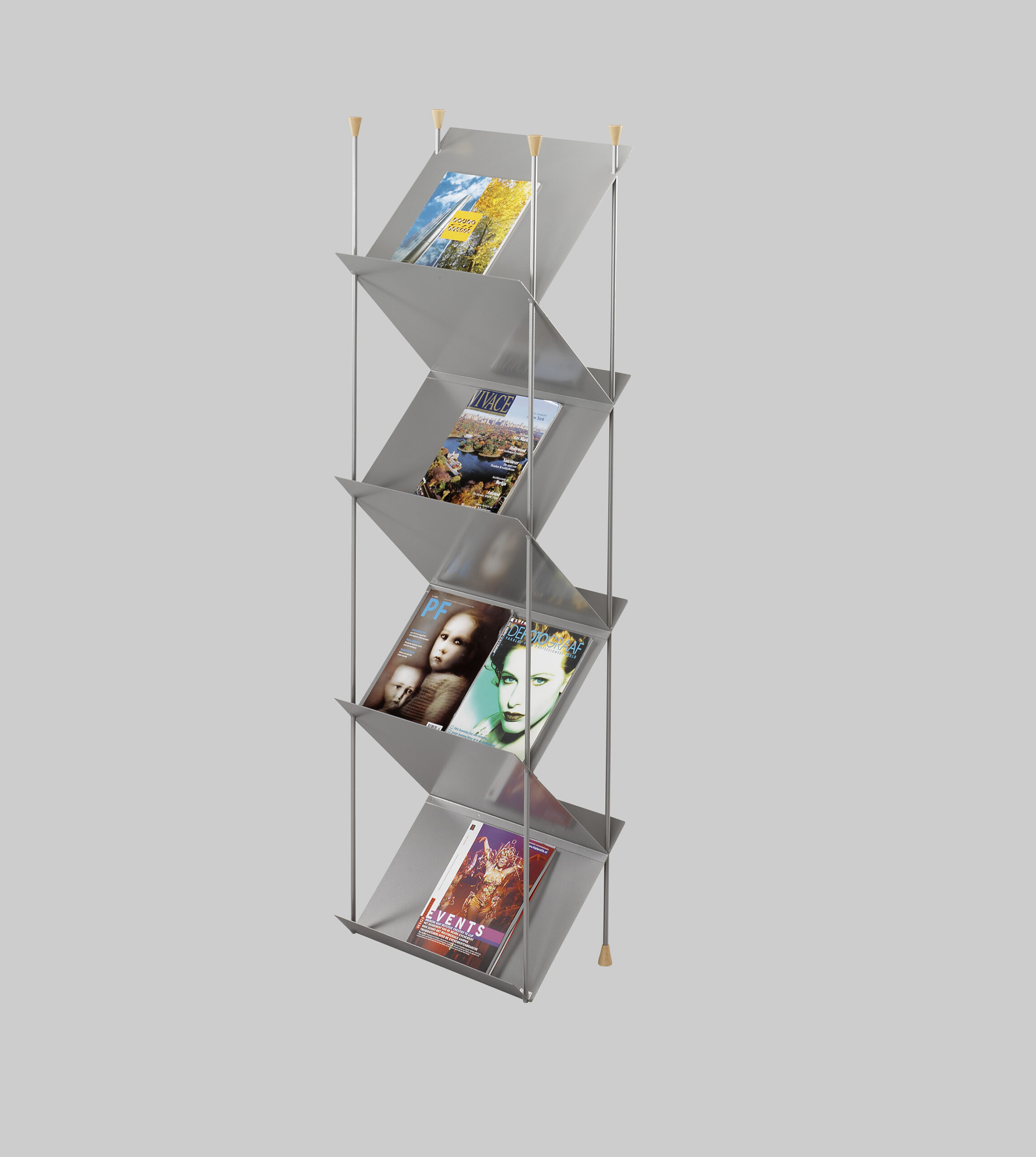 DR430Der Prospektständer PROFESSIONAL 2 Zigzag Aluminium ist ein moderner und funktionaler Ständer mit sieben geneigten Ablagen für eine ansprechende Präsentation von Prospekten und Magazinen. Mit einer Höhe von 171 cm, einer Breite von 52 cm und einer Tiefe von 29,5 cm bietet dieser Aluminium-Ständer ausreichend Platz und Stabilität für die Messe- und Eventpräsentationen.