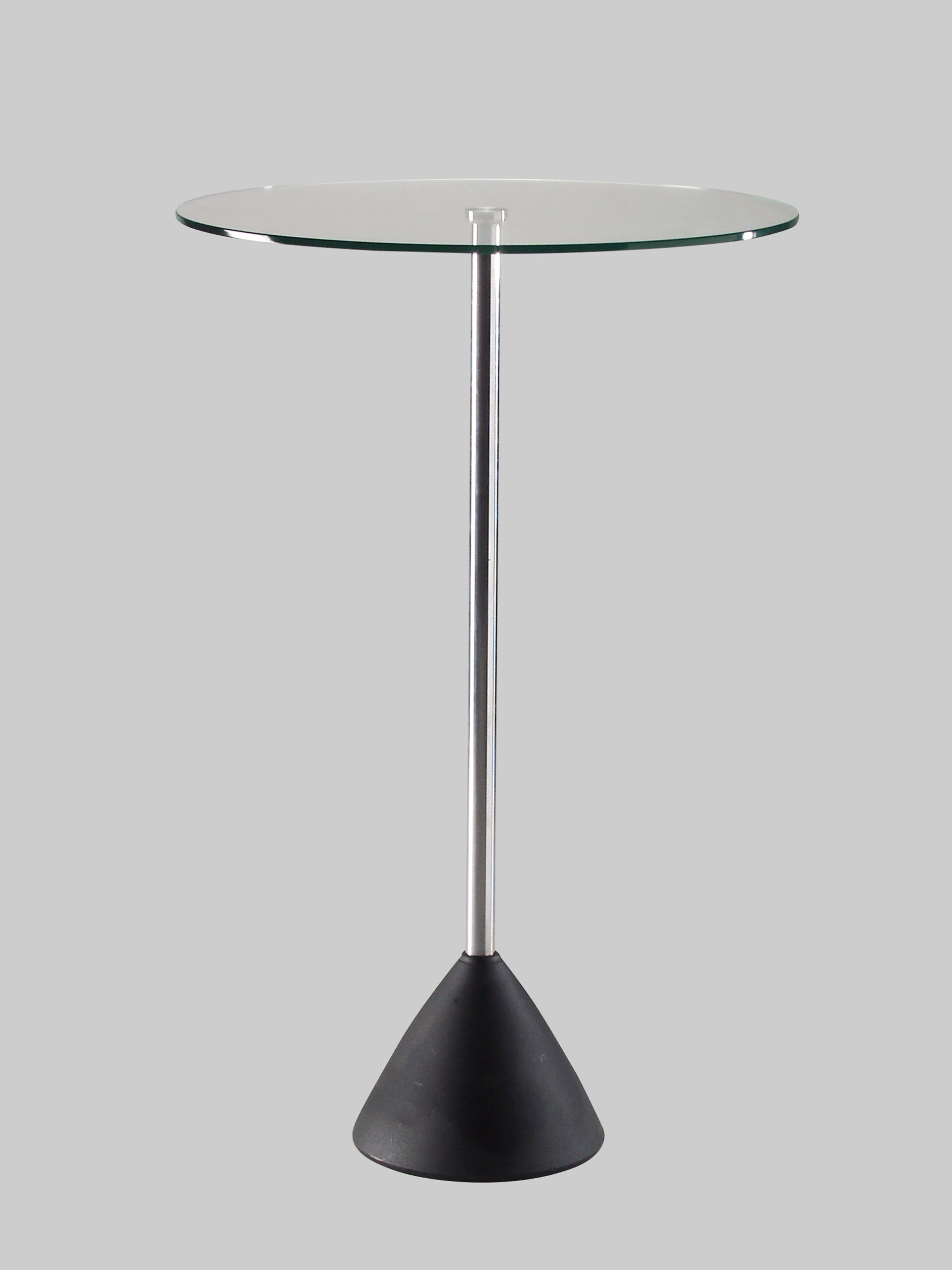 T7080Der Stehtisch COBALT Ø70 ist die ideale Wahl für Messen und Veranstaltungen, bei denen stilvolles Design im Vordergrund steht. Der von Gerard Vollenbrock entworfene Tisch kombiniert eine transparente Glasplatte mit einem verchromten Metallgestell. Mit einer Höhe von 110 cm und einem Tischdurchmesser von 70 cm bietet er ausreichend Platz, um Getränke oder Informationsmaterial stilvoll zu präsentieren. Der konische, schwarze Fuß sorgt für Stabilität und einen modernen Look. Miete diesen eleganten Stehtisch, um deine Veranstaltung aufzuwerten.