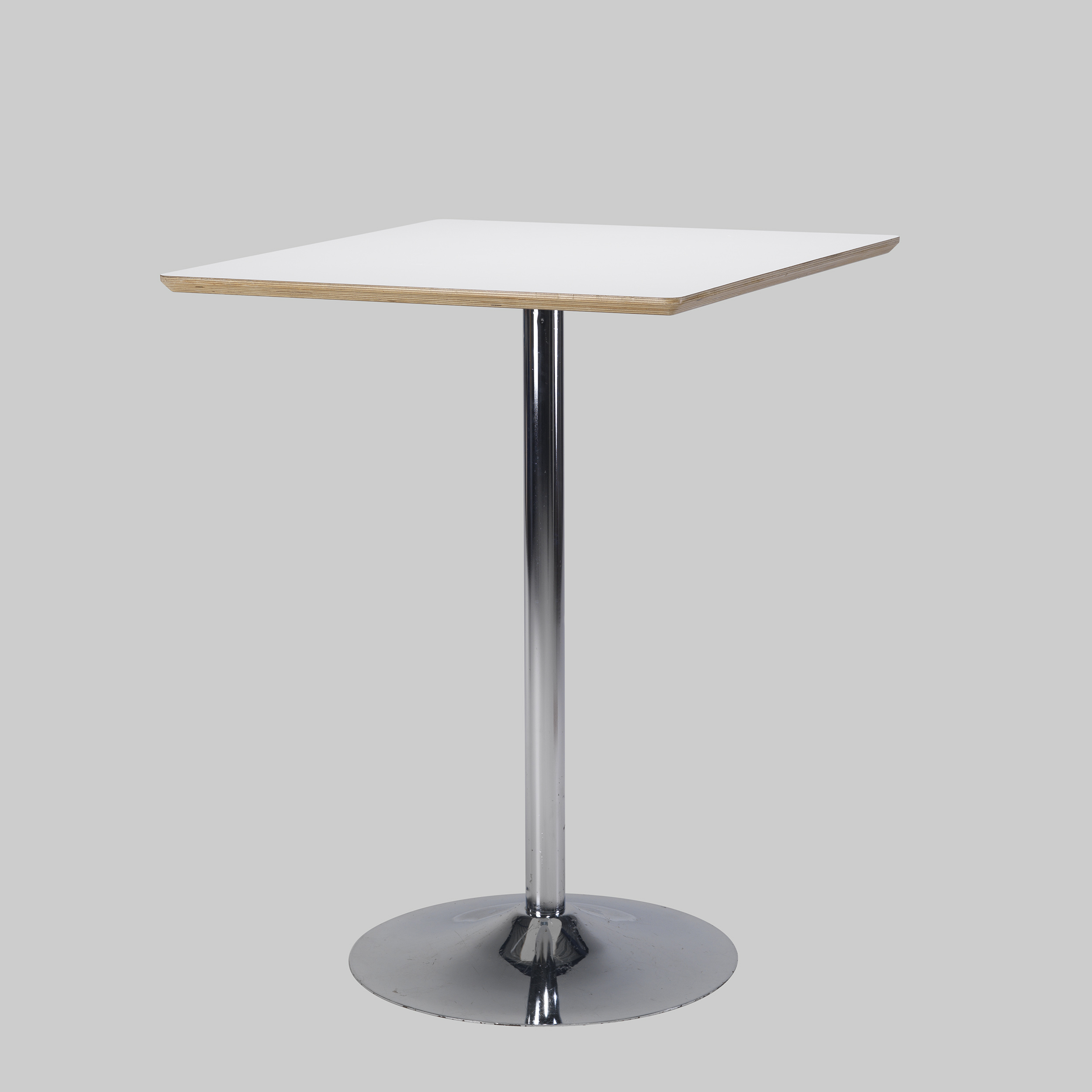 T7522 mit holzkanteDer Stehtisch TROMPET 80x80 in Weiß und Chrom überzeugt durch sein zeitloses Design und hohe Funktionalität, perfekt für Messen und Veranstaltungen. Mit einer Höhe von 107 cm und einer quadratischen Tischfläche von 80x80 cm bietet er genügend Platz für Präsentationen und Gespräche. Die weiße Tischplatte mit sichtbarer Holzkante bringt Frische und Eleganz in jeden Raum, während der verchromte Fuß Stabilität und eine moderne Optik bietet. Das robuste Sperrholz in Kombination mit dem Metallgestell macht den Tisch langlebig und pflegeleicht. Ob als Besprechungstisch oder stilvoller Treffpunkt auf deinem Messestand, der Stehtisch TROMPET passt sich flexibel an. Miete den Stehtisch TROMPET 80x80 in Weiß und Chrom und erlebe die Vielseitigkeit dieses Designs!